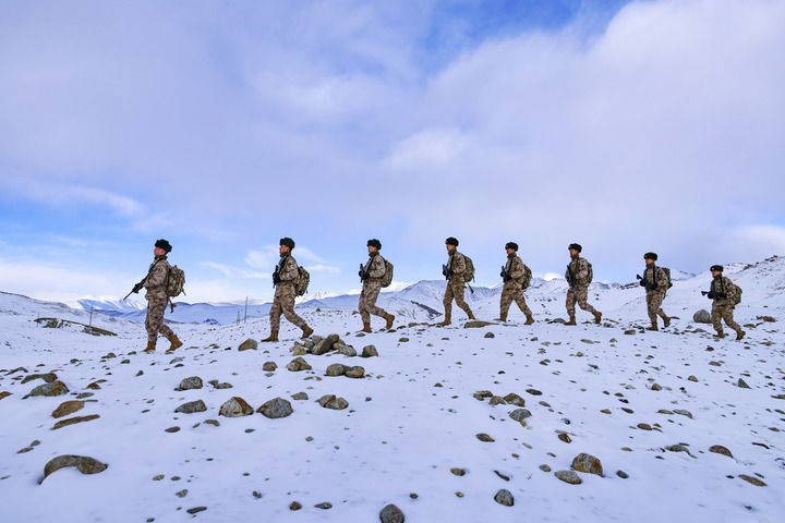 2024年2月9日,驻守帕米尔高原的新疆军区某边防团红其拉甫边防连官兵踏雪巡逻。