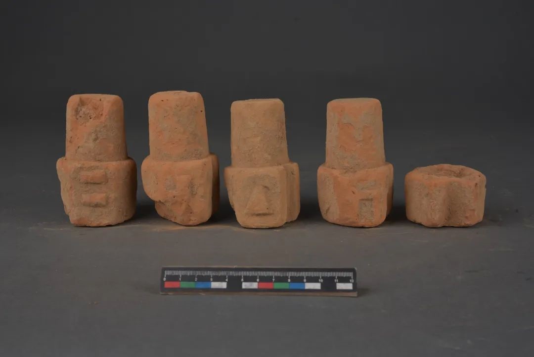烧窑共发现5座,其中Y3的窑室呈近圆形,直径2.7-3.2米,北侧顶部有一排烟口,操作间位于窑室南部,中间低洼,两侧为平台,出入口位于操作间的东南部。在操作间的东南部有十余组竖直摆放的陶管,将入口处封堵。从进出通道清理情况知,专门放置陶管的沟槽打破上下操作间的台阶,推断陶管为烧窑废弃或使用一段时间后封堵的。窑室及操作间内出土丰富的陶量残片,及绳纹陶拍、陶支垫、陶器口沿、板瓦残块等。部分陶量的口沿、内壁、内底部戳印小篆体“公”字。陶量有三种规格,大者口部内径19厘米,内高14厘米。中者口部内径15厘米,内高11厘米。小者口部内径13厘米,内高7.8厘米。陶量为直壁筒状,部分陶量器壁表面有一方底尖顶凸起。Y4位于Y3南部,窑室呈圆形,直径1.4米,近底部有七个烟道,窑室南部为火塘,与操作间相连。窑室内仅出土少量烧制火候低的碎陶片,从结构分析,该窑为升焰窑。Y5位于南部建筑的中院内,由操作坑、火门、灶台、烟道四部分组成。操作坑口部呈近似椭圆形,斜壁内收,口部南北长约1.90米,东西长约1.60米,底部平面有踩踏痕迹。火门位于操作坑南端,内壁见烧结面,平顶。宽约0.5米,高约0.2米,进深0.4米。灶台为双灶台,南北排列,口部形状近似两个相切的圆形,北灶台口部直径约0.70米,南灶台口部直径约0.4米。烟道位于灶台南侧,口部形状为长方形,直壁。