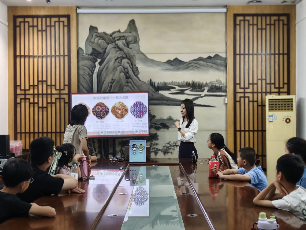 活动伊始,讲解员以生动有趣的语言,向青少年们娓娓道来宋锦的千年历史。从“七十二道工序”的繁复工艺,到自然染料萃取的奇妙过程;从金箔捻线织造的独特技法,到“五方正色”蕴含的东方哲学,每一个细节都让孩子们听得入神。当讲解员展示宋锦实物时,那富丽堂皇的色彩、细腻精美的纹样,瞬间抓住了孩子们的目光,惊叹声此起彼伏。最令人期待的实践环节,青少年们化身 “非遗小传人”,充分发挥想象力与创造力,将宋锦的绚丽纹样与苗银的精美造型巧妙融合,春绯、夏翠、秋缃、冬玄的宋锦色块,与银饰纹样相互映衬,千年文明在稚嫩的巧手中焕发新生。孩子们一边制作,一边热烈讨论,现场气氛热烈而欢快。当一件件独具特色的冰箱贴作品诞生时,孩子们脸上洋溢着自豪的笑容,家长们也纷纷用手机记录下这珍贵的瞬间。